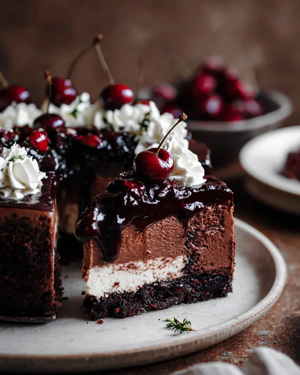 For an extra pop of flavor and texture, consider topping your black forest cheesecake with fresh fruits or toasted nuts. Cherries are, of course, a classic pairing—dotted with sliced almonds or crushed hazelnuts can create a delightful crunch. For a burst of color and freshness, feel free to add a handful of berries, like raspberries or strawberries, to the mix. The combination of sweet, tart, and rich flavors will leave your guests asking for seconds!