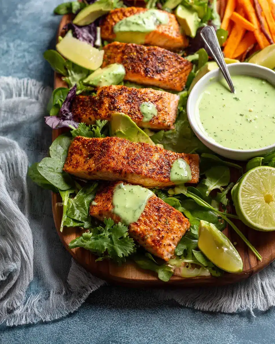 After the baking time is up, remove the salmon from the oven. Plate the salmon and generously drizzle it with your homemade avocado lime sauce. It’s versatile, so you can even dress your salad with it for an extra zing! Enjoy your beautifully prepared Cajun-Spiced Baked Salmon with the vibrant salad on the side—it's bound to impress everyone at your table.