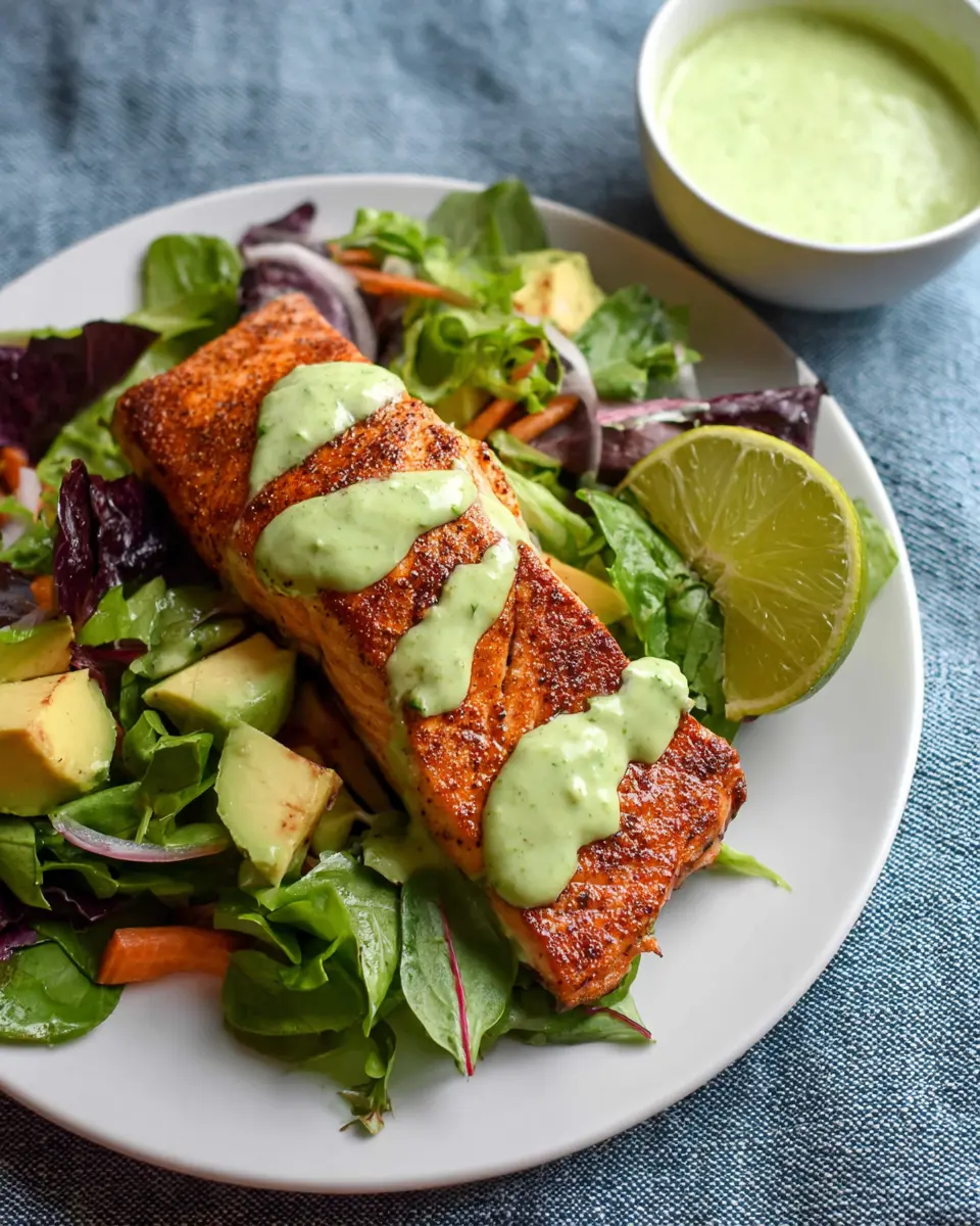 - Serve the baked salmon with the avocado lime sauce. You can also dress the salad with the sauce.