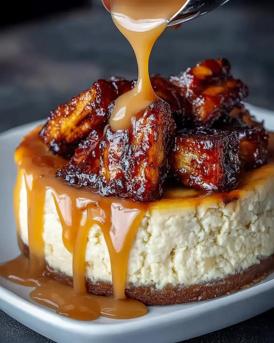 - Once the cheesecake is completely cool, top with caramelized bananas. Drizzle with rum glaze and serve immediately.