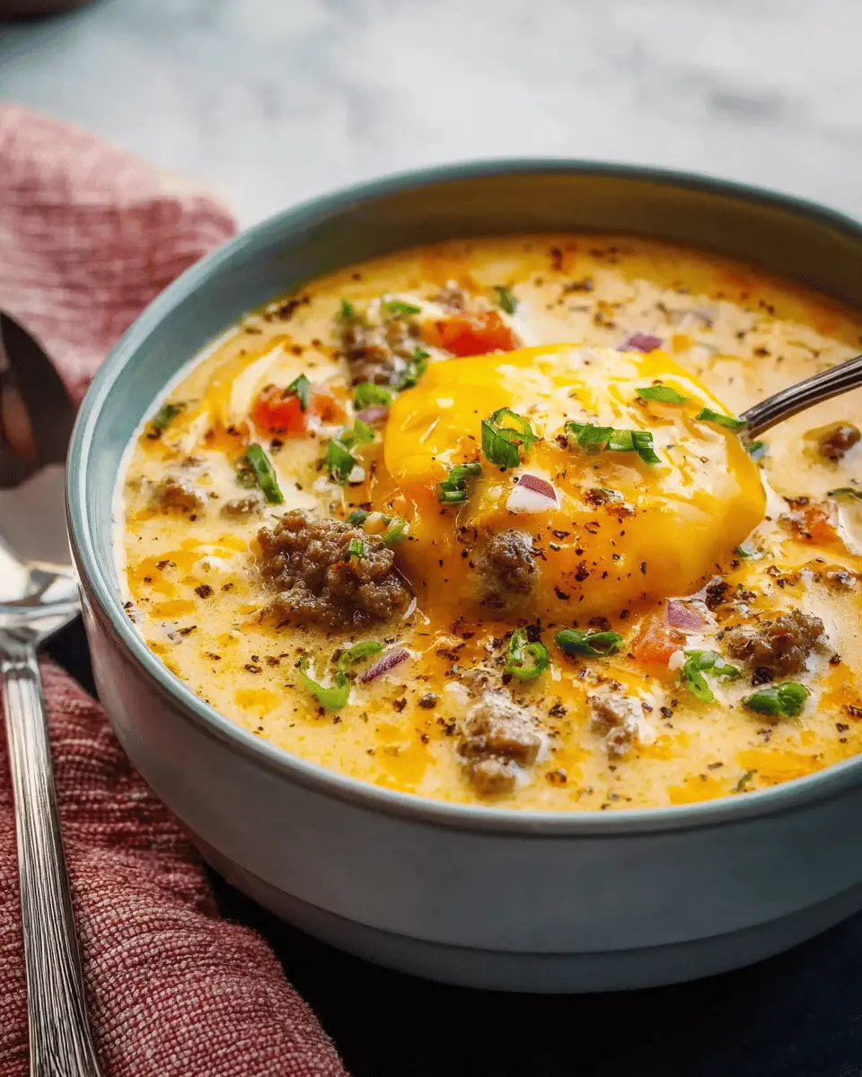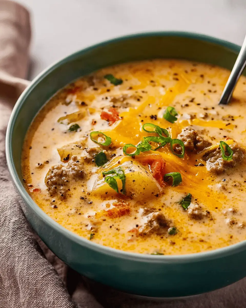 Once your cheeseburger soup is complete, ladle it into bowls, and don’t forget to add some garnishes! Sliced green onions add a lovely crunch and brightness. You can also mix in some diced pickles, turkey bacon, or crispy onions for a fun twist on traditional burger toppings. Enjoy a warm bowl of this comforting soup, and savor every bite!