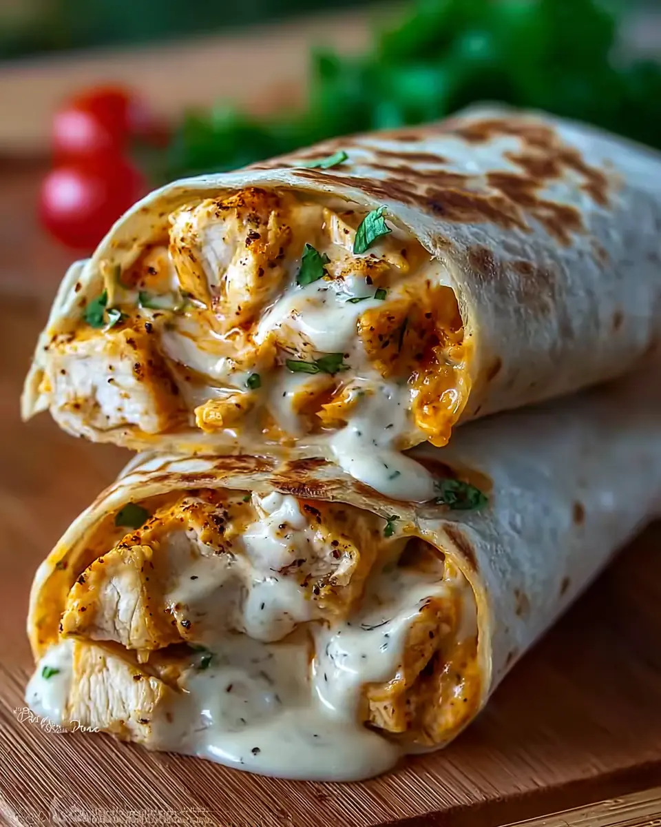 Calories: Each serving of Cheesy Garlic Chicken Wraps contains approximately 476 calories. This makes them a satisfying option for lunch or dinner, offering energy without the heaviness often associated with wraps.