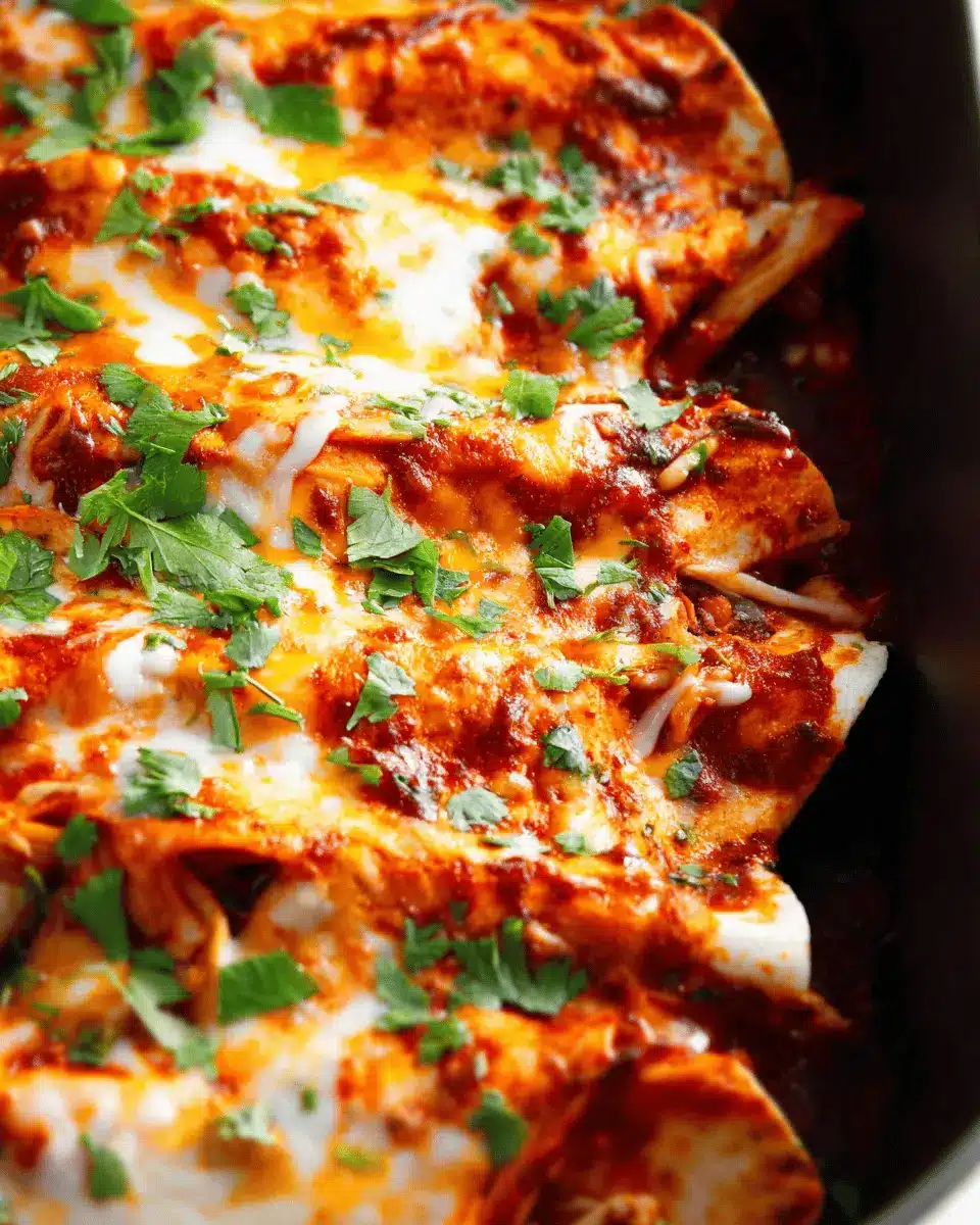 It's finally time to dig in! Serve your enchiladas hot, garnished with fresh toppings like cilantro, chopped red onions, diced avocado, and a dollop of sour cream for that extra oomph. Enjoy every bite of these flavorful enchiladas with friends or family—you’ll definitely impress them! Whether it’s a casual weeknight dinner or a cozy gathering, these Chicken Enchiladas are sure to become a beloved staple in your home. Happy cooking!