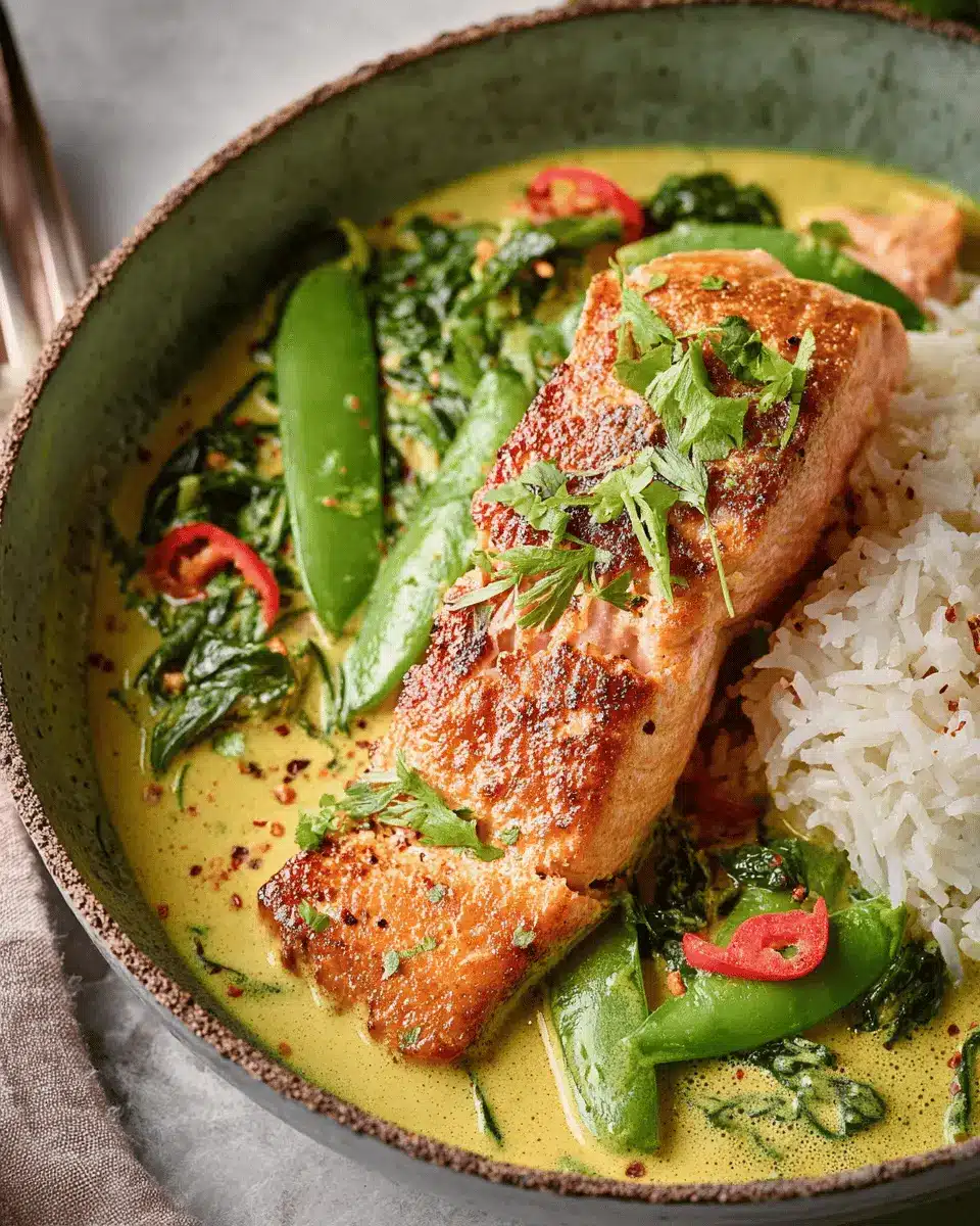 When baking, aim for a final internal temperature of 145˚F. To ensure even cooking, consider using a meat thermometer. Additionally, allow the salmon to rest for a few minutes after removing it from the oven—this lets the juices redistribute, keeping your Coconut Curry Salmon moist and flavorful. For more cooking insights, check out resources like Cooking Light for expert tips.