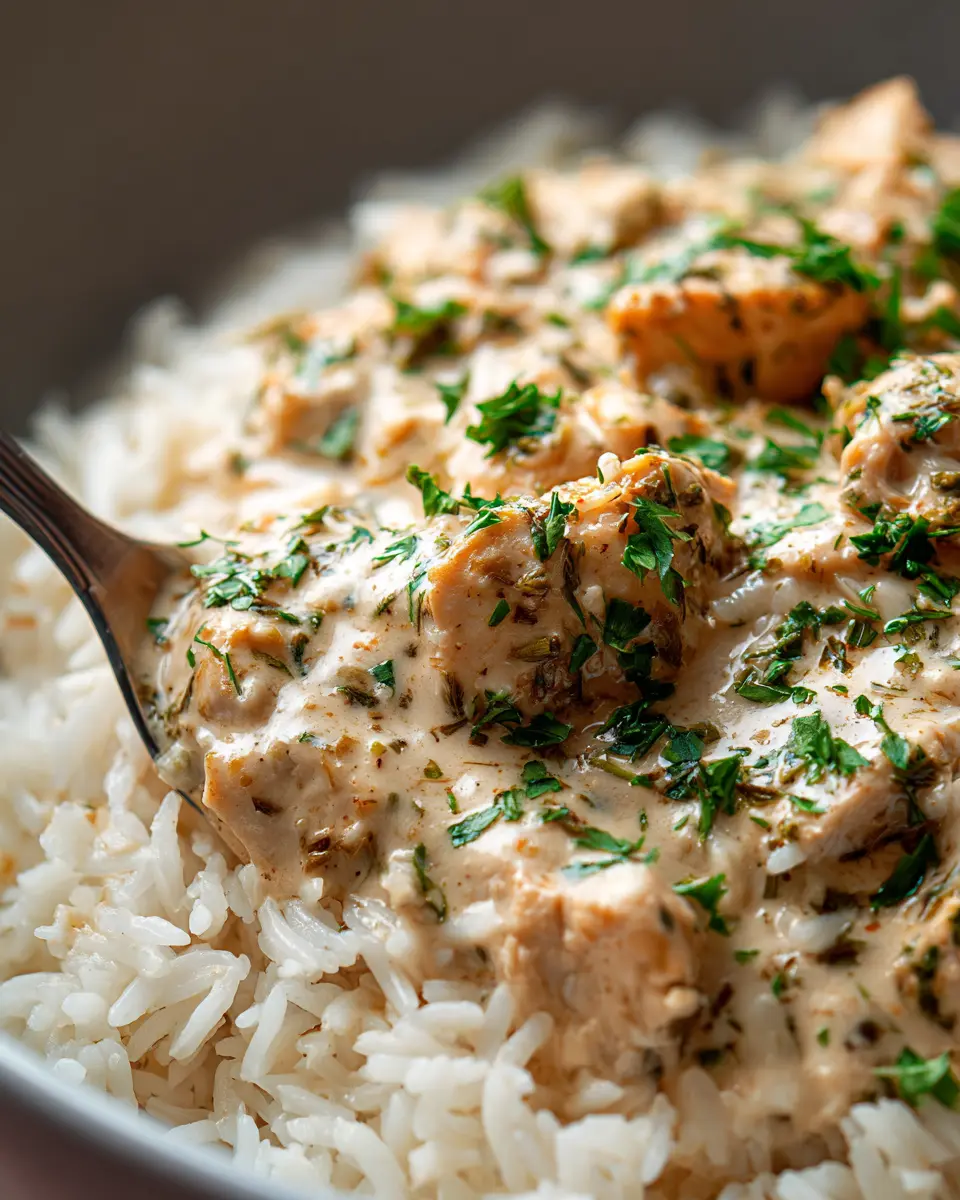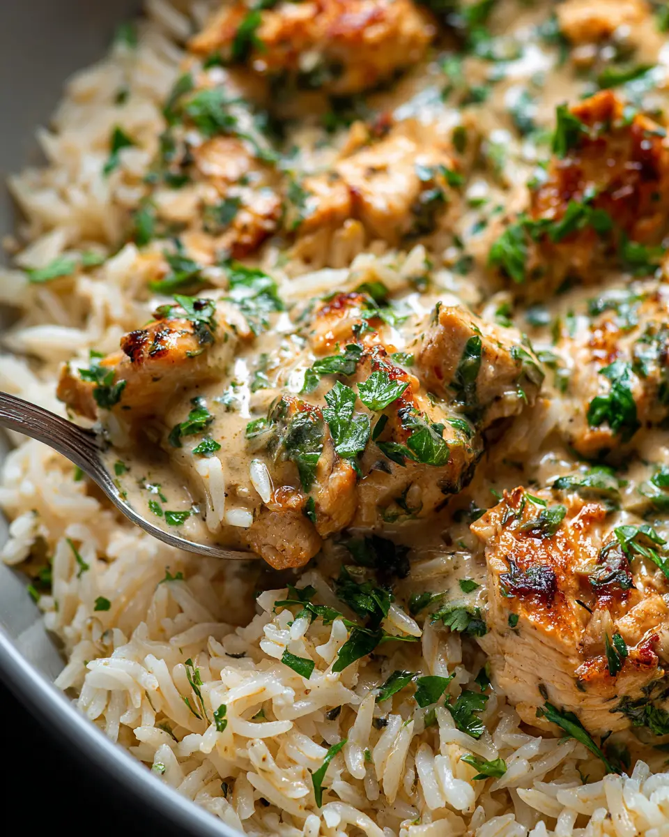 Now for the final touch! Spoon your creamy herb chicken generously over the warm basmati rice. This is where the magic happens—every bite will showcase the creamy texture and aromatic flavors.