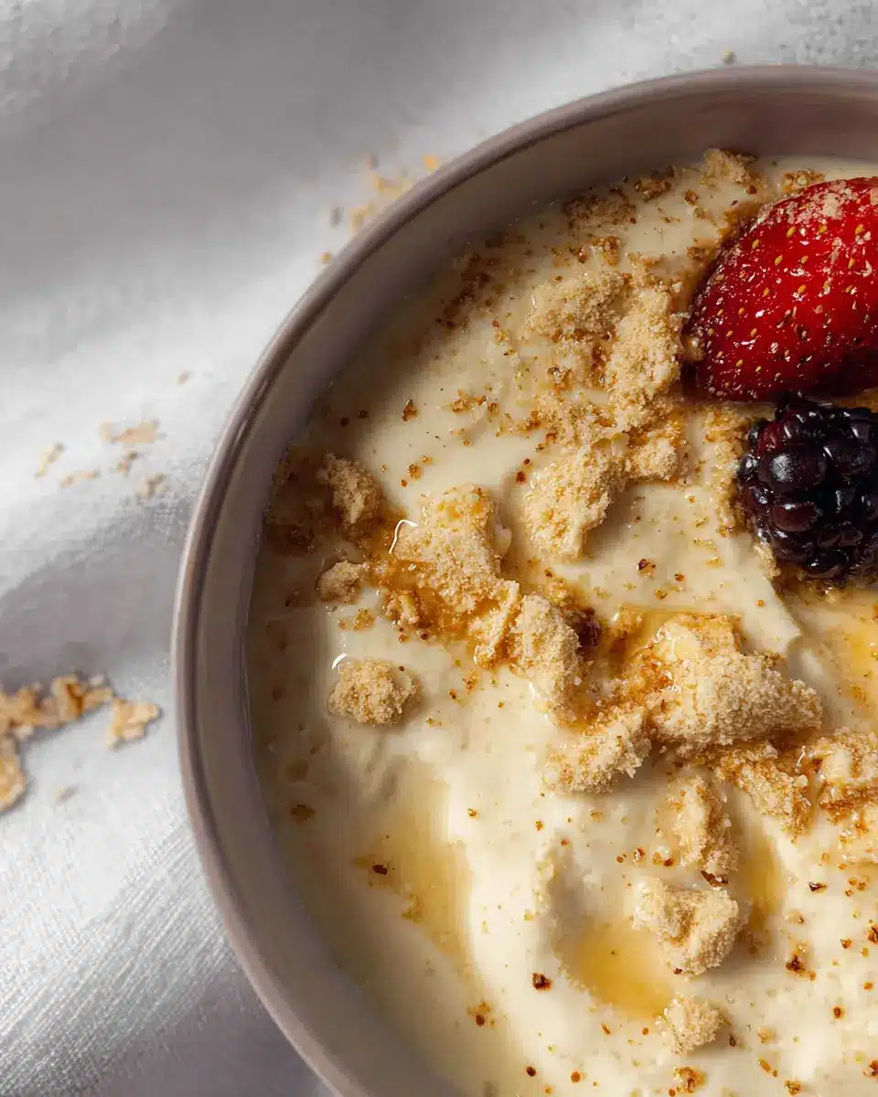Now it's time to add your favorite toppings! Think brown sugar, fresh fruit, or a splash of cream for extra richness. Enjoy this creamy oatmeal custard for breakfast, or save it as a sweet treat anytime during the day!