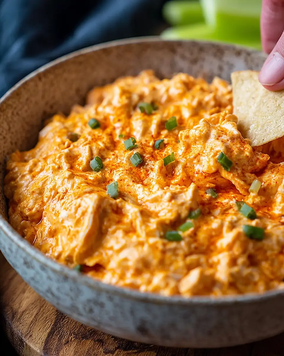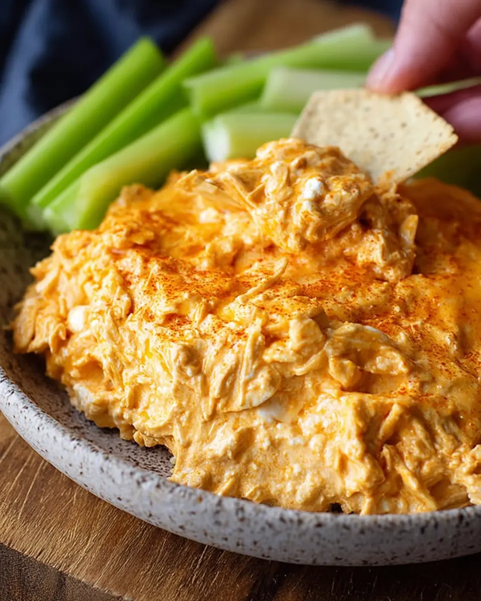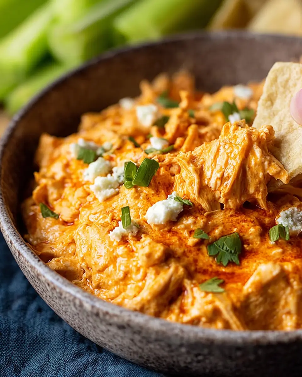 Now for the best part: serving! Transfer your Crock Pot Buffalo Chicken Dip to a serving bowl, or simply serve it straight from the crock pot. Pair it with tortilla chips, crunchy carrots, or celery sticks for dipping.