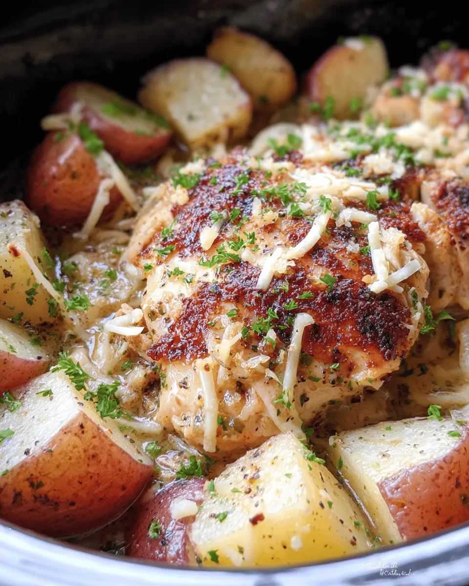 To elevate your dining experience, plate the Crockpot Garlic Parmesan Chicken And Potatoes on a bed of fluffy rice or quinoa. This will soak up the delicious garlic Parmesan sauce. For a rustic touch, serve it family-style in a cast-iron skillet, encouraging everyone to dig in! Don’t forget to sprinkle fresh herbs like parsley or chives for a pop of color and flavor. And for a twist, serve with a side of crusty bread to mop up that cheesy goodness!