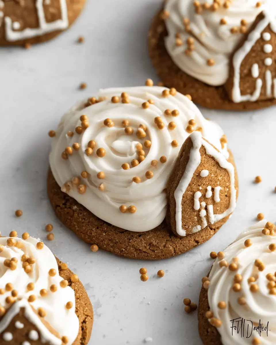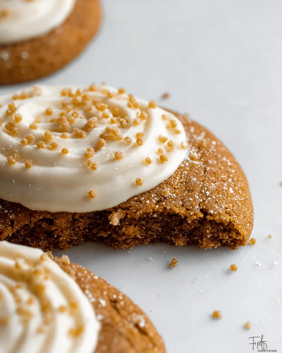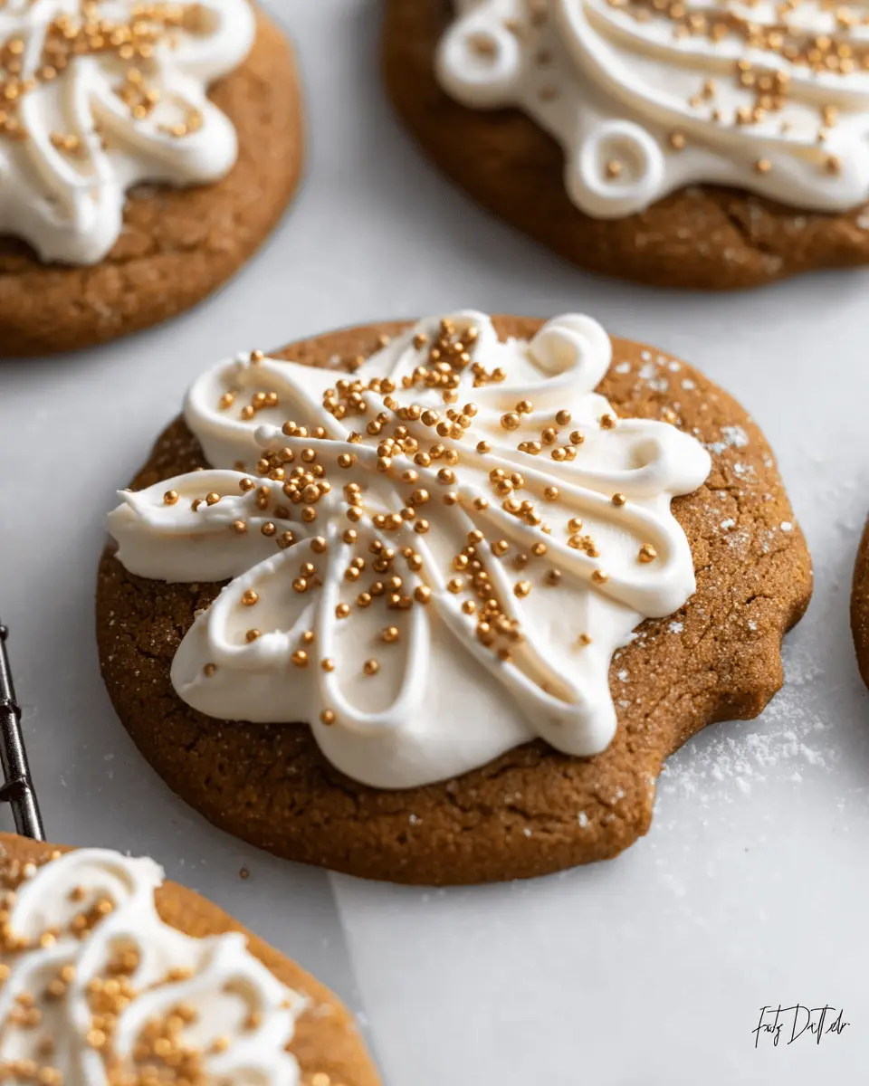 Once your cookies are cool, grab a piping bag fitted with a large round tip, and frost each cookie generously with your delicious cream cheese mixture. Feel free to get creative with the toppings! Sprinkles, crushed candy cane, or even extra ground ginger can add that festive flair.