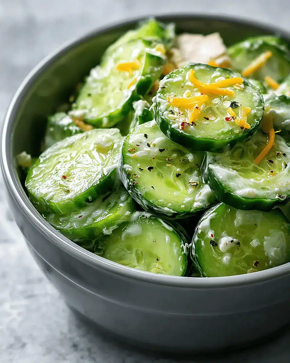 Finally, drizzle the avocado lime ranch dressing over your concoction. Give everything a gentle stir to ensure those cucumbers are evenly coated. The dressing adds a tangy richness that pulls all the flavors together.