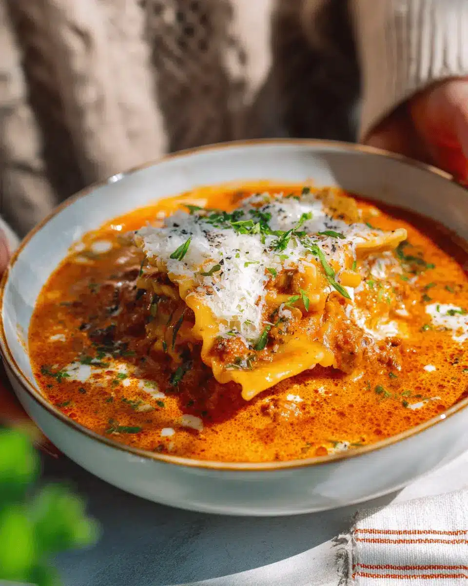 Garnishing Easy Creamy Lasagna Soup elevates both flavor and visual appeal. Top each serving with a generous dollop of the creamy ricotta mixture. A sprinkle of freshly grated parmesan adds a salty bite, while a few basil leaves provide a pop of color. For extra flair, a drizzle of olive oil can enhance richness and elevate the overall look of your bowl. Don't forget a crack of black pepper for a finishing touch that complements the flavors beautifully. Your guests will be impressed!