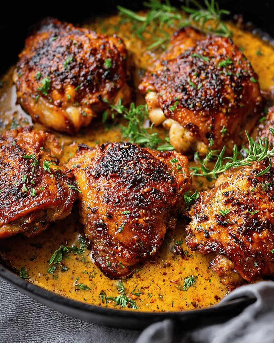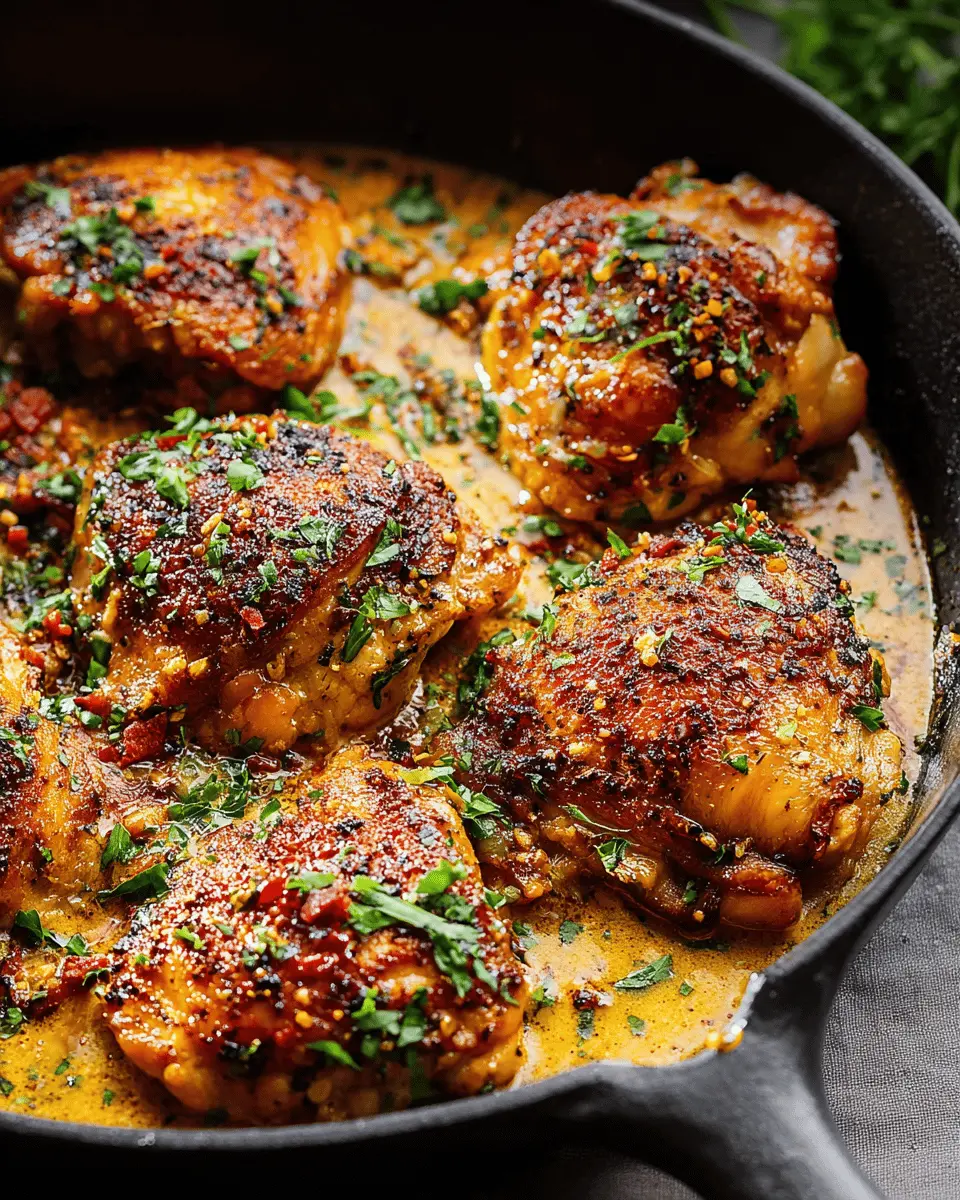 Craving something with a kick? Transform your easy skillet chicken thighs into Spicy Garlic Butter Chicken Thighs by adding red pepper flakes and a dollop of spicy sauce to your butter mix. This boosts the heat while maintaining the juicy tenderness of the chicken. Pair it with rice or quinoa to soak up the flavorful sauce and satisfy your taste buds. Don't forget to garnish with fresh chopped cilantro for that extra touch!
