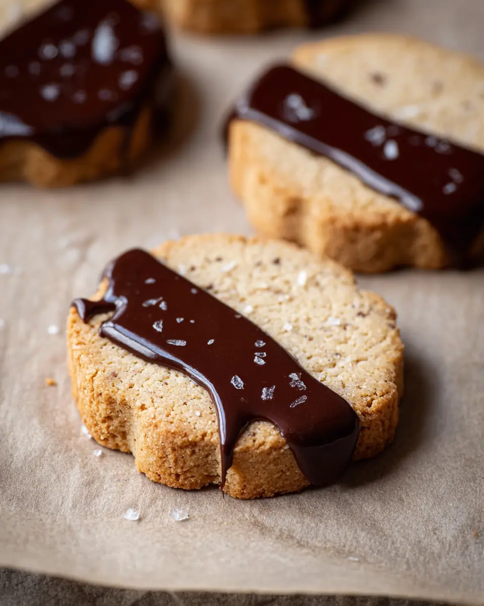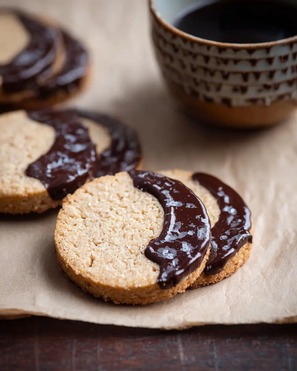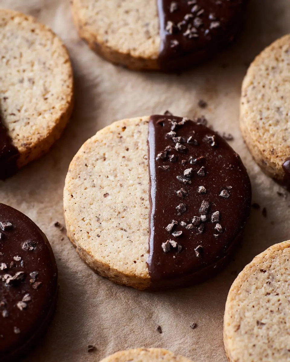 For an extra touch of indulgence, let’s dip those cookies! In a microwave-safe bowl, combine dark chocolate and coconut oil. Heat in 20-second intervals, stirring gently until smooth. Dip half of each cookie into the chocolate, letting the excess drip off. Allow them to sit for about 10 minutes to set before enjoying these delightful Espresso Shortbread Cookies.