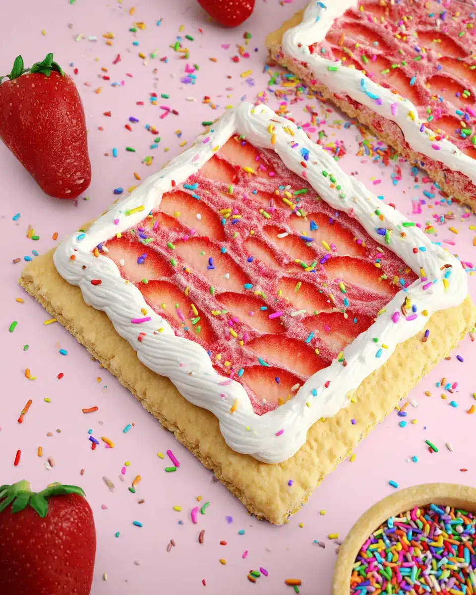 Finally, the moment has come to glaze your wonderful giant strawberry pop tart! Whisk together 1 cup of confectioners’ sugar, 1 tablespoon of milk, and ½ teaspoon of vanilla extract until smooth. If necessary, add more milk to get the perfect pourable consistency. Pour this glaze over your cooled pop tart and sprinkle on some colorful rainbow sprinkles. Allow the glaze to harden for about 5 minutes before slicing into squares to serve. Who can resist a slice of that?