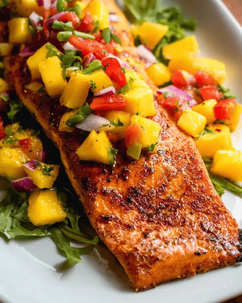 - Layering: Place the salmon in the center of the plate, allowing the juicy mango salsa to cascade over the top.