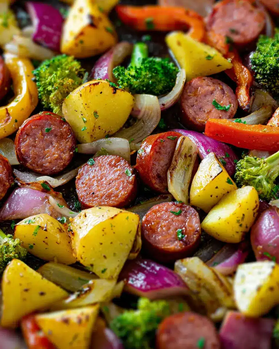 Not a fan of kielbasa? No problem! This recipe is versatile enough to swap in Turkey Bacon for a lighter option or Chicken Ham for a smokier flavor. For those looking to avoid processed meats altogether, chicken breast or tofu can take center stage! Experiment and discover what you love most; that’s the joy of sheet pan dinners!