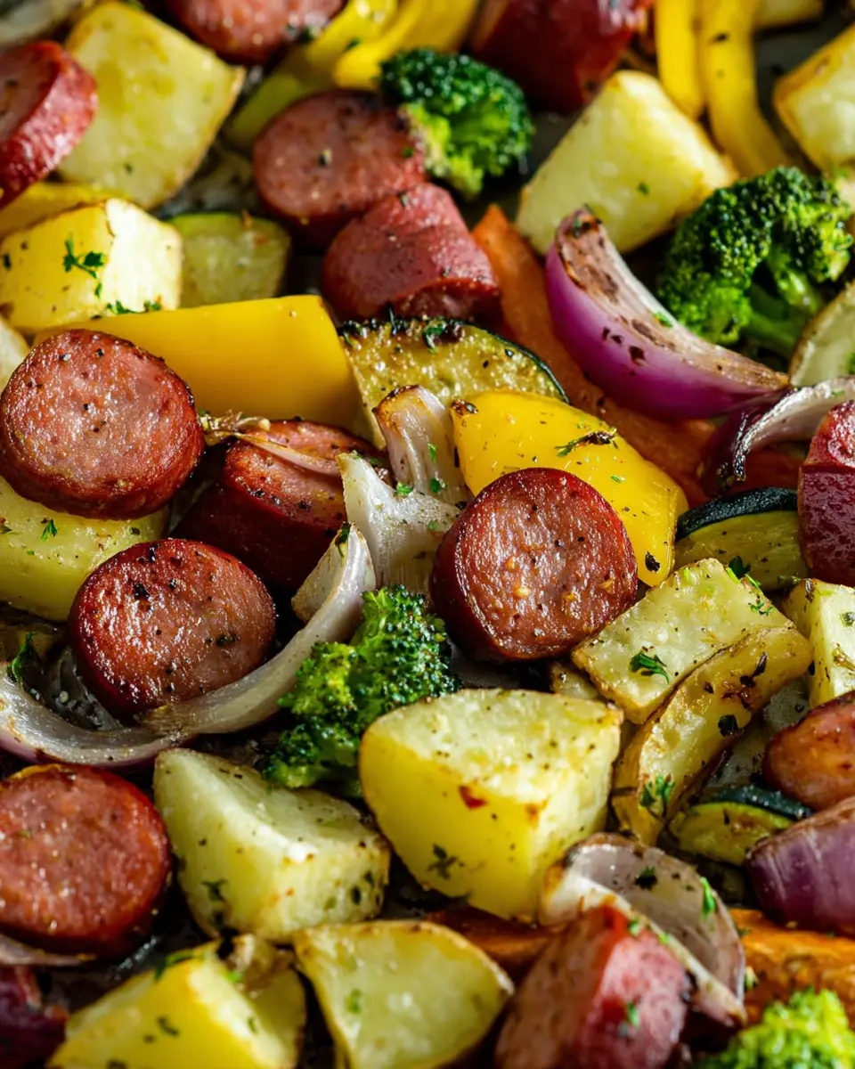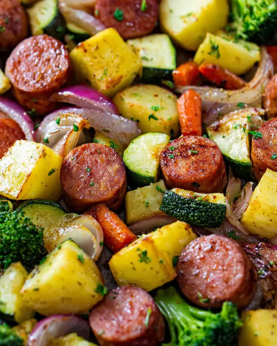 Packed with flavor and essential nutrients, this dish delivers about 20 grams of protein per serving, thanks primarily to the kielbasa and vibrant veggies.