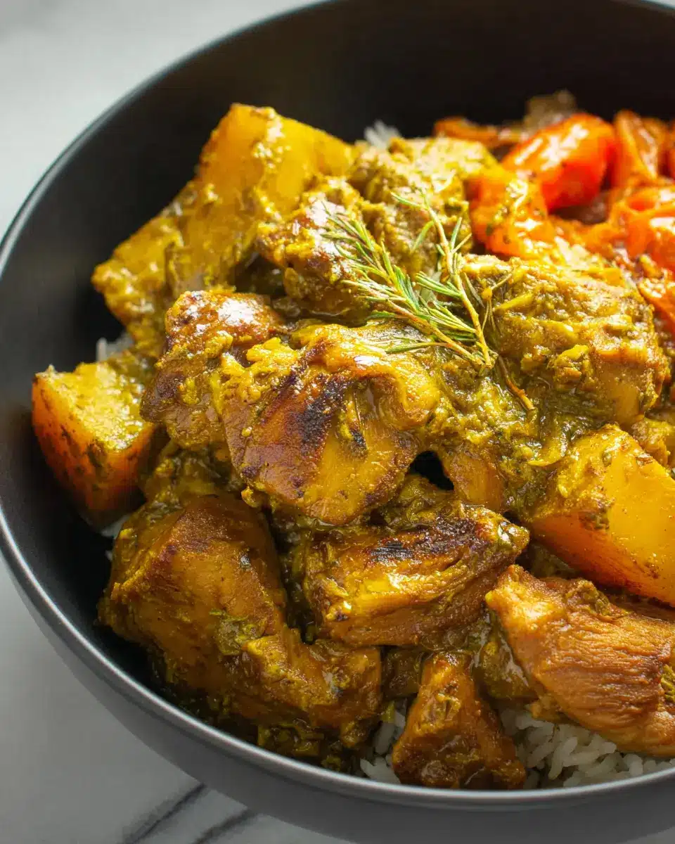 Start by grabbing your 3 lbs of skinless dark meat chicken. In a mixing bowl, add 1 ½ teaspoons of adobo seasoning and 1 tablespoon of green seasoning. Drizzle ½ tablespoon of olive oil over the chicken and make sure every piece gets a good massage—think of it as a spa day for your meat! Next, toss in chopped green onions, sliced yellow onion, and 1 ½ tablespoons of Jamaican curry powder. Don’t forget the diced scotch bonnet pepper for that authentic Jamaican kick! Cover the bowl and let the chicken marinate for at least 30 minutes (longer if you have the time). The flavors will deepen, and trust me, you won’t regret the wait.