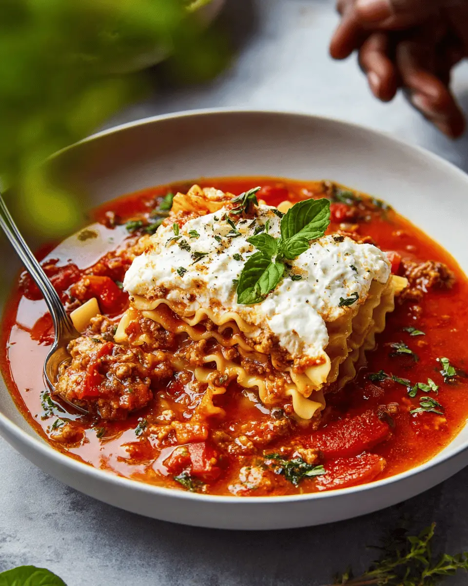 When everything is ready, serve your hearty lasagna soup in bowls, generously dolloping about 1-2 tablespoons of the cheesy mixture on top. Add a sprinkle of fresh parsley for color and serve it with a side of warm garlic bread. There you have it—your homemade masterpiece is complete! Enjoy every spoonful of this delicious blend of flavors and heartiness that brings the essence of lasagna right to your bowl.