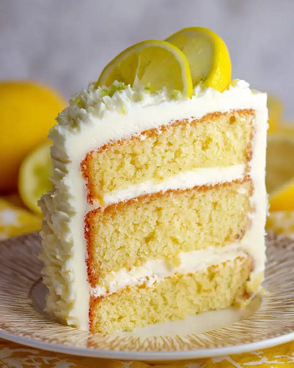 Once the cakes are fully cool, it’s assembly time! Trim any dome tops for an even layering. Place the first cake on your serving plate, spread a generous layer of frosting on top, then repeat with the second layer. Finish with the final layer of cake and frost the entire outside. Want to get fancy? Add some swirls and garnish with lemon slices!