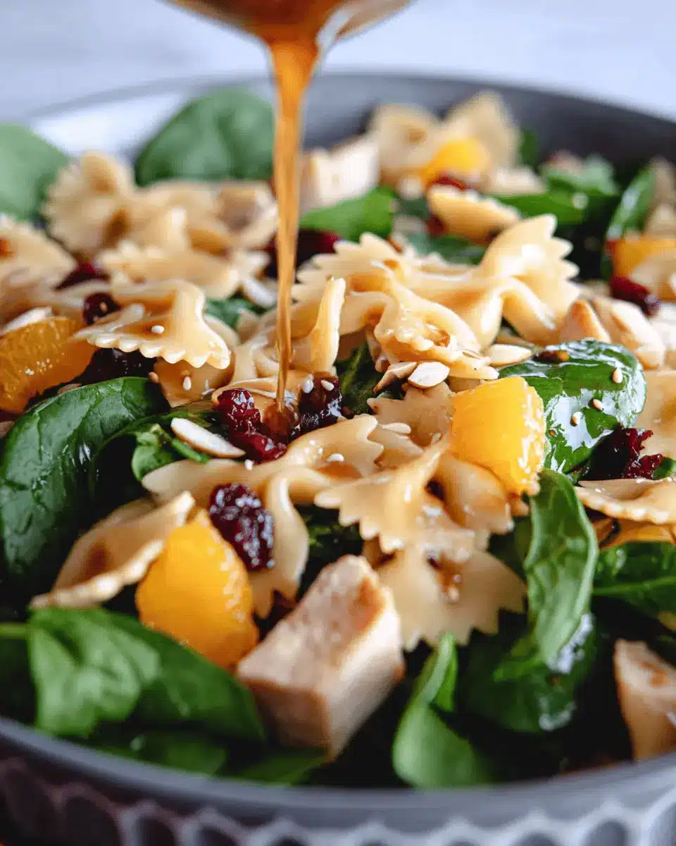 Mandarin Spinach Bowtie Pasta Salad with Teriyaki Dressing