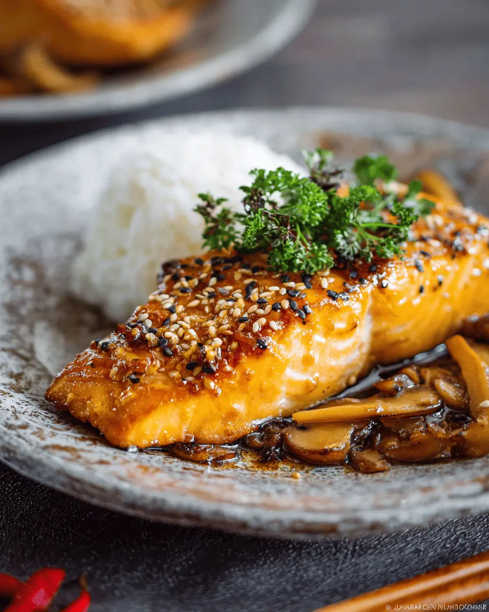 Once everything is perfectly cooked, transfer your delectable salmon and mushrooms to a plate, and don’t forget to garnish with freshly chopped chives and toasted sesame seeds. There you have it—a stunning dish that's both impressive and easy to prepare!