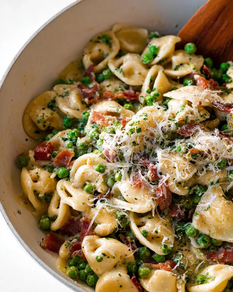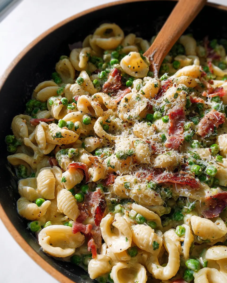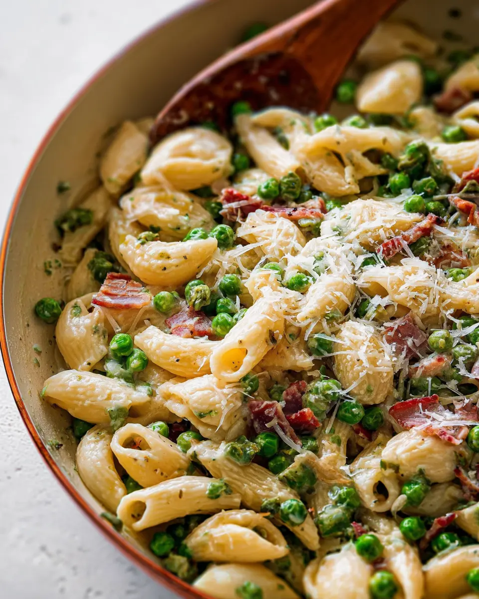 To keep your creamy pasta with pancetta and peas fresh, store leftovers in an airtight container in the fridge for up to three days. When ready to enjoy again, reheat gently on the stovetop with a splash of reserved pasta water to restore the creamy texture. Avoid using the microwave, if possible, as it may heat unevenly and affect the sauce consistency.