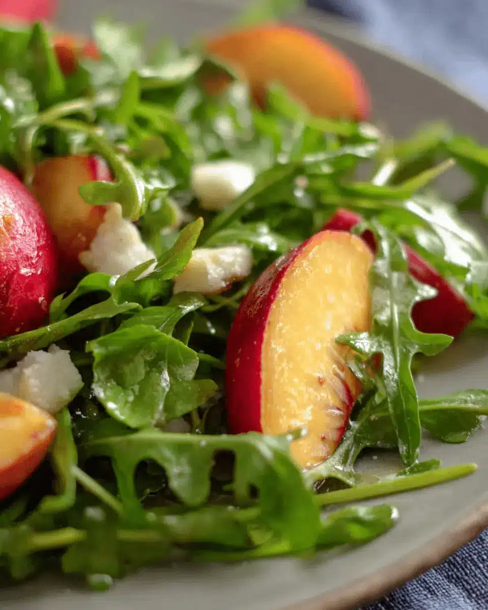 Now, all that’s left is to bring those delightful components together! In a large bowl, combine the sliced peaches and arugula. Gently pour the dressing over them and toss everything lightly. The goal here is to evenly coat the arugula and peaches without bruising the delicate greens or breaking the peach slices.