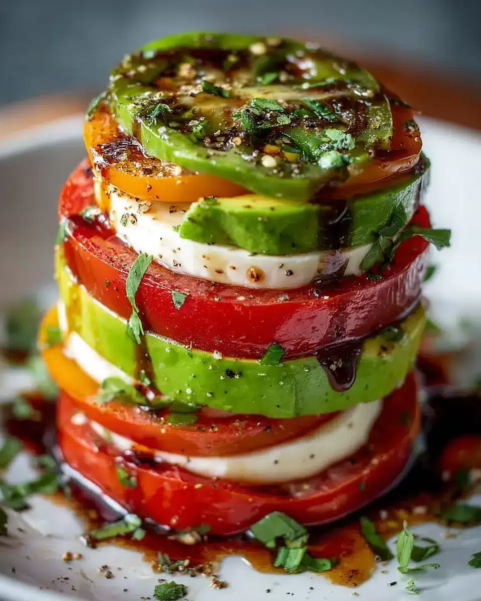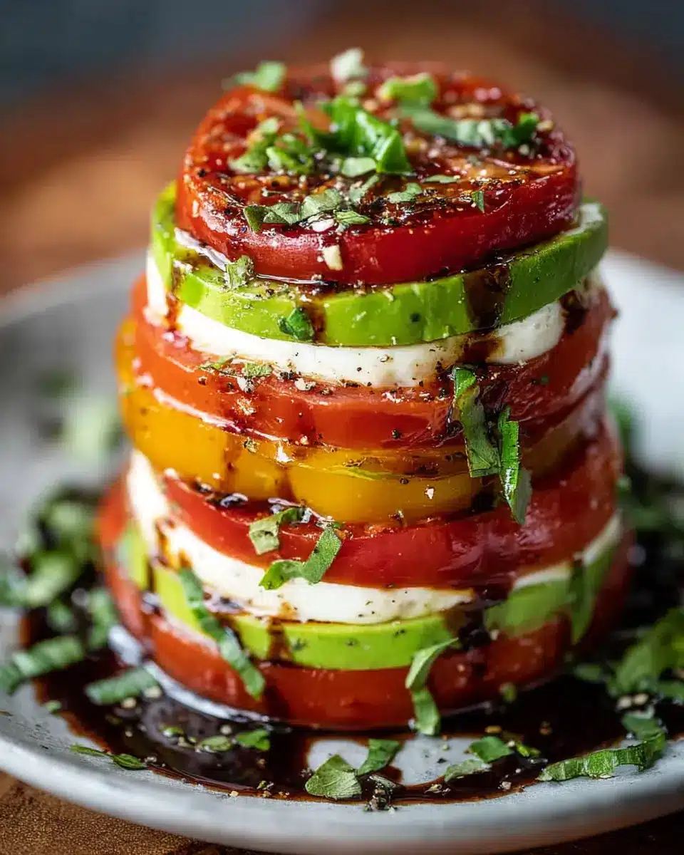 A Caprese tower showcases layers of luscious roasted tomatoes, creamy avocado, and rich mozzarella, all topped with fragrant basil and drizzled with balsamic glaze. The roasting process brings out the natural sweetness of the tomatoes, adding depth to every bite. In just a few steps, you can create an impressive tower that looks like it could grace the pages of a gourmet magazine. It’s both easy and elegant—perfect for impressing guests or simply indulging yourself.