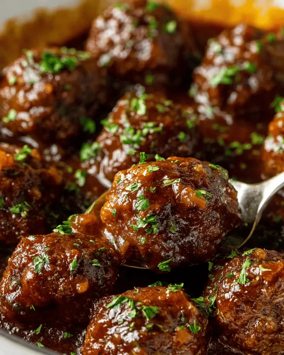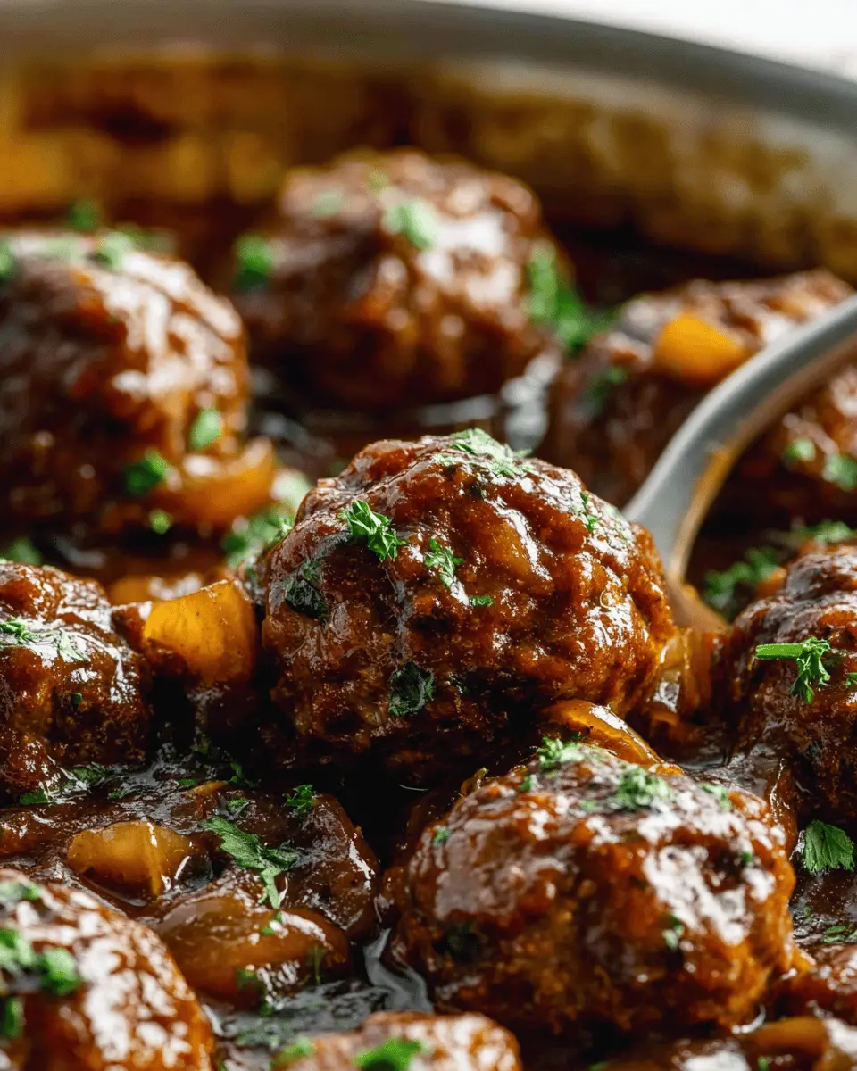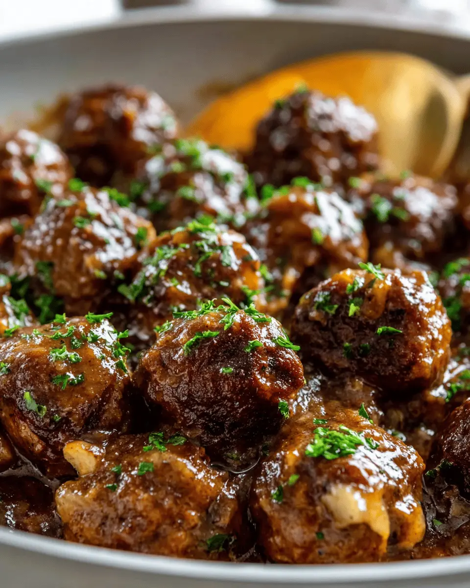 Once your gravy has reached that perfect consistency, it’s time to bring back the meatballs. Gently add them to the skillet, coating them well in the onion gravy. Let them simmer for an additional 5 minutes to absorb all those luscious flavors. Before serving, don’t forget to garnish with a sprinkle of fresh parsley for that final touch!