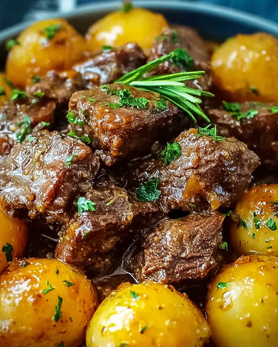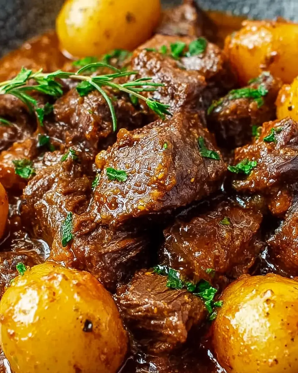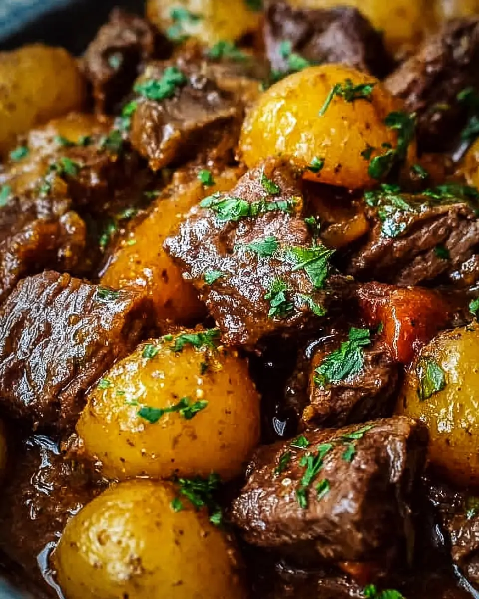 Once everything is perfectly cooked, carefully remove the beef and potatoes from the slow cooker onto a serving platter. Drizzle some of the saucy goodness left in the cooker over the top. For a pop of color and freshness, garnish with chopped parsley before serving. The presentation will wow your guests!
