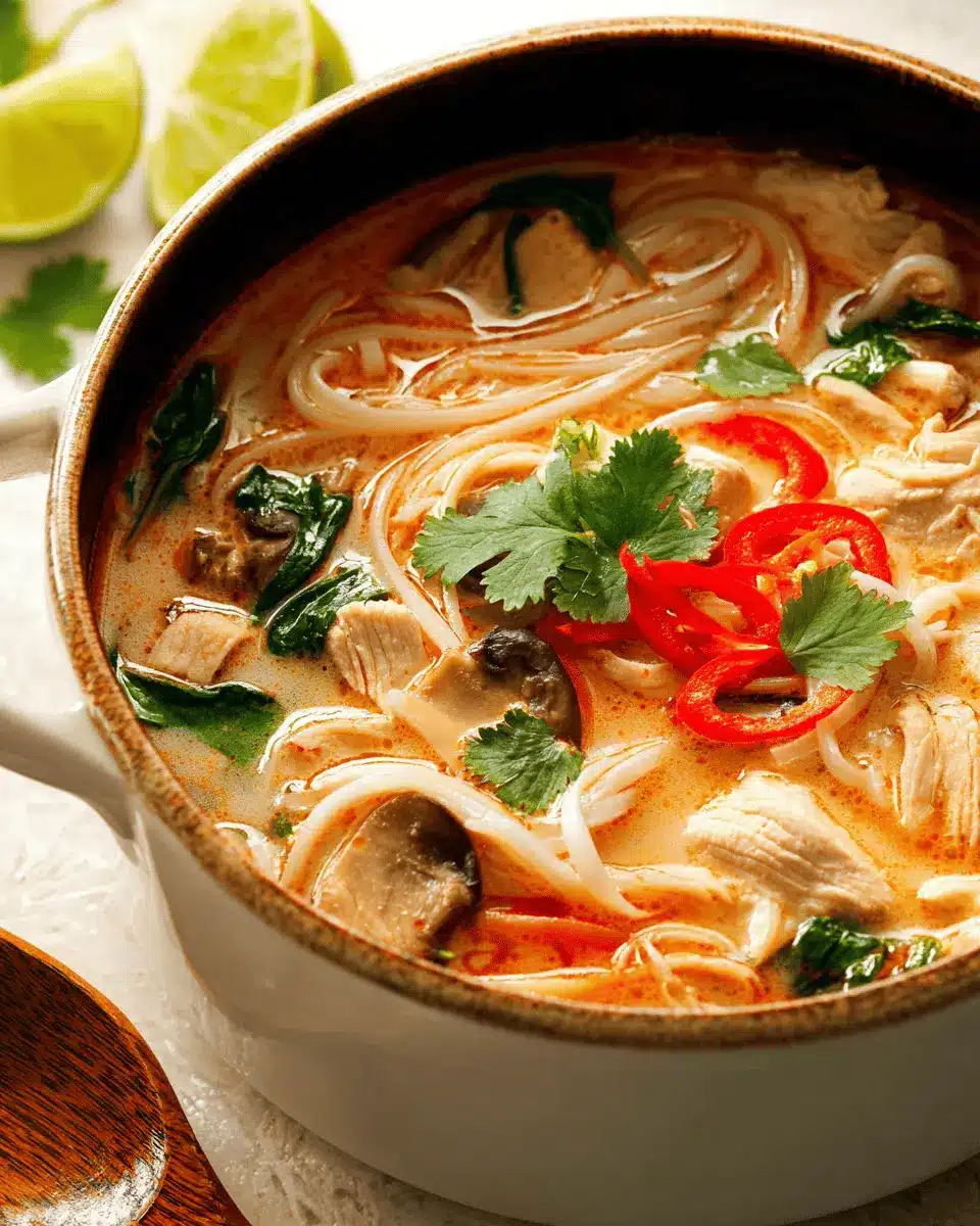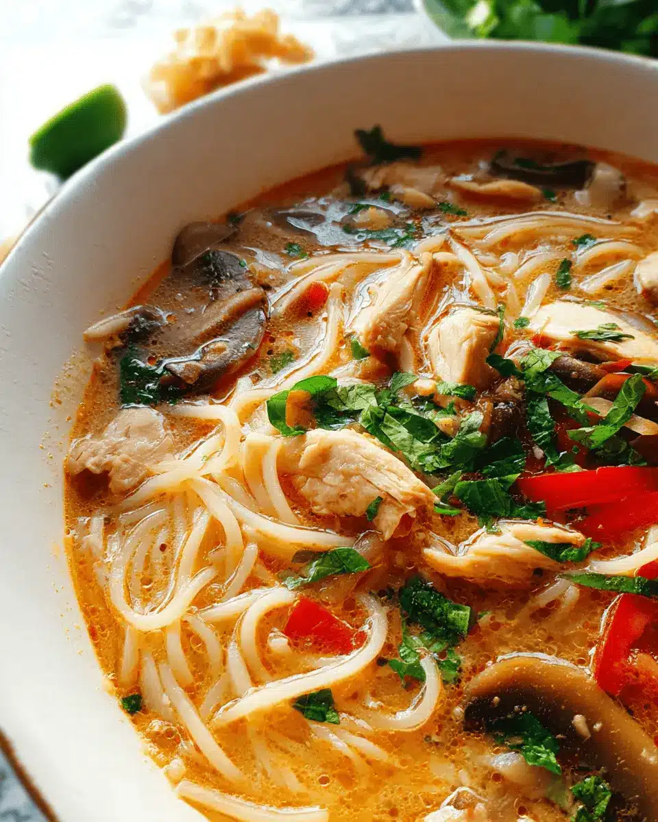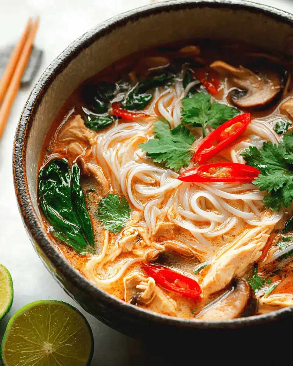 Presentation is key to enjoying any dish. Serve your Thai Chicken Noodle Soup in vibrant bowls to showcase the fresh ingredients. Top it generously with fresh herbs like cilantro and Thai basil, and consider adding a sprinkle of crushed peanuts for added flavor and a lovely visual touch. Adding lime wedges on the side not only enhances flavor but also adds a pop of color to your meal.