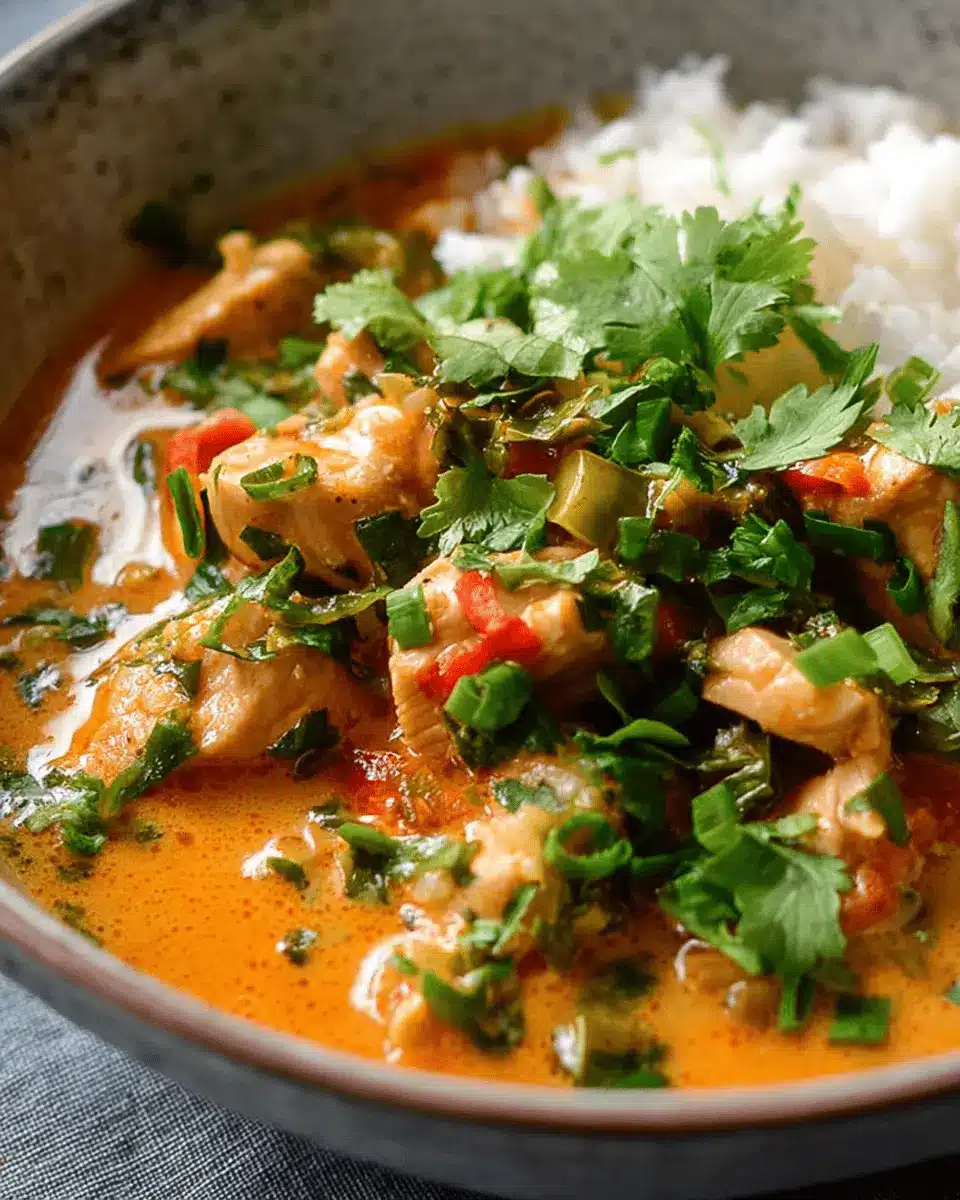 Don’t skip the fresh cilantro and scallions; they add bright flavor and visual appeal to your Thai Red Curry Chicken.