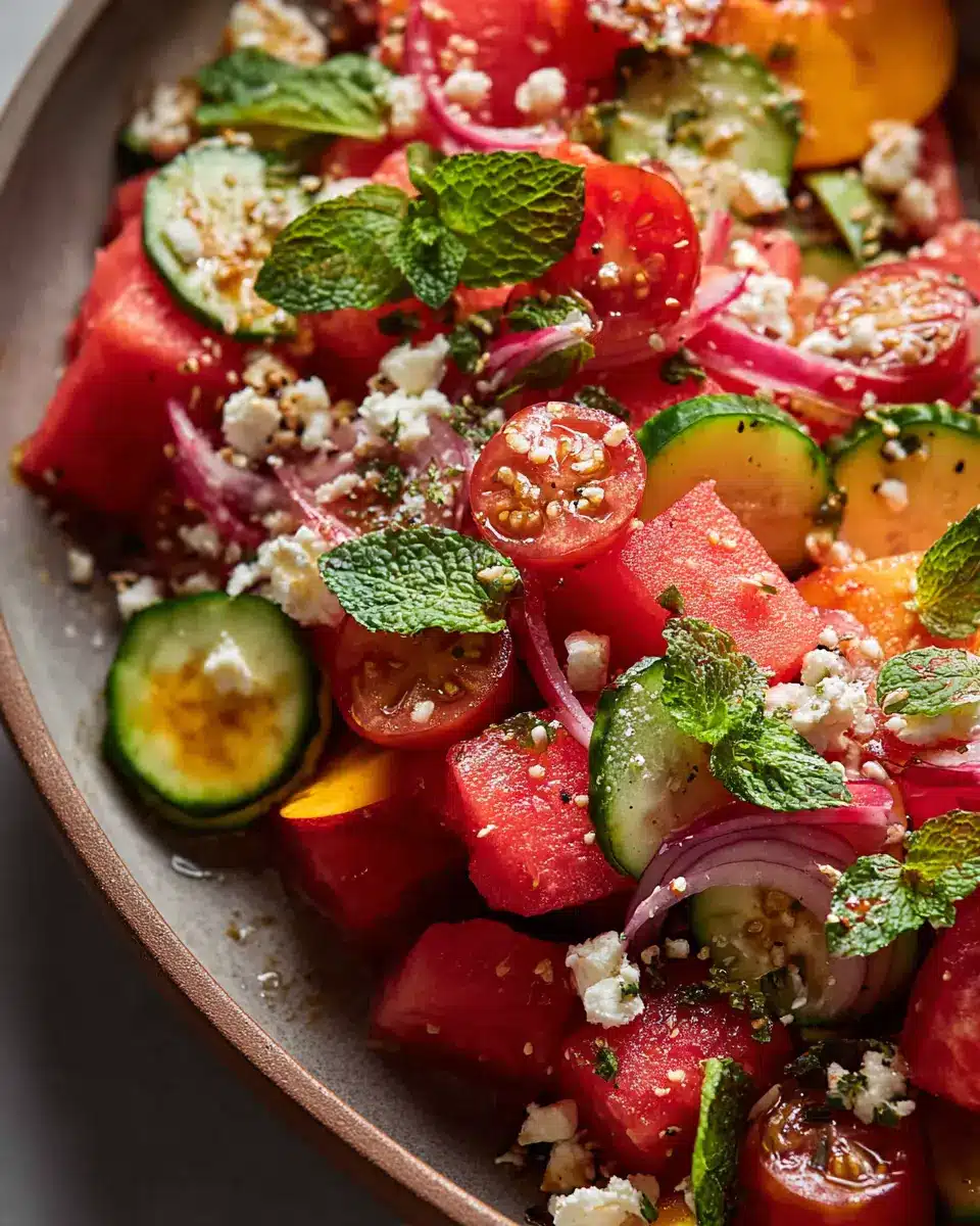Presentation is everything! Try serving your Watermelon Peach Salad in hollowed-out watermelon halves or mason jars for a rustic touch. Garnish with additional mint leaves and a sprinkle of feta for color. You can even layer the ingredients in a trifle dish for an eye-catching centerpiece that will impress your guests.