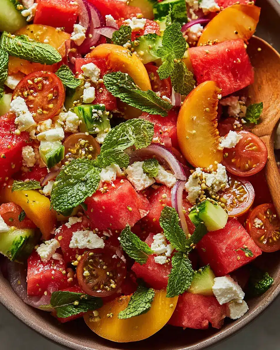 Once your watermelon is marinated and begging to be eaten, it’s time to enhance the salad with those juicy peaches and crunchy cucumbers. Add the sliced yellow peaches into the bowl along with the cubed feta cheese and cucumber rounds. Give it a gentle toss to combine all the ingredients without breaking the delicate peaches or cheese. This colorful blend will not only look fantastic on your serving platter but also balance the sweetness with savory notes beautifully.